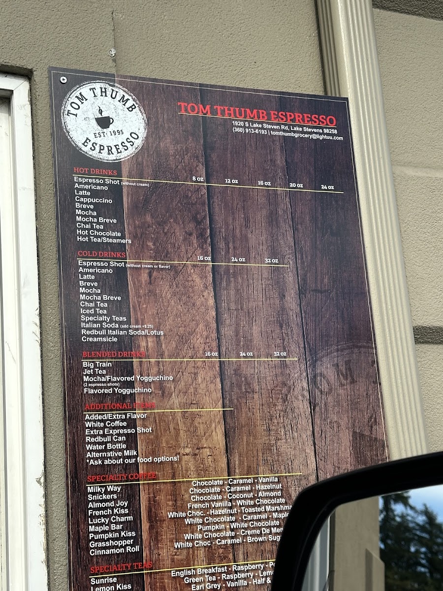 The menu at Tom Thumb Espresso offers a variety of beverage options primarily focused on coffee and specialty drinks. The selection is organized into three main categories: hot drinks, blended drinks, and other beverages and treats.